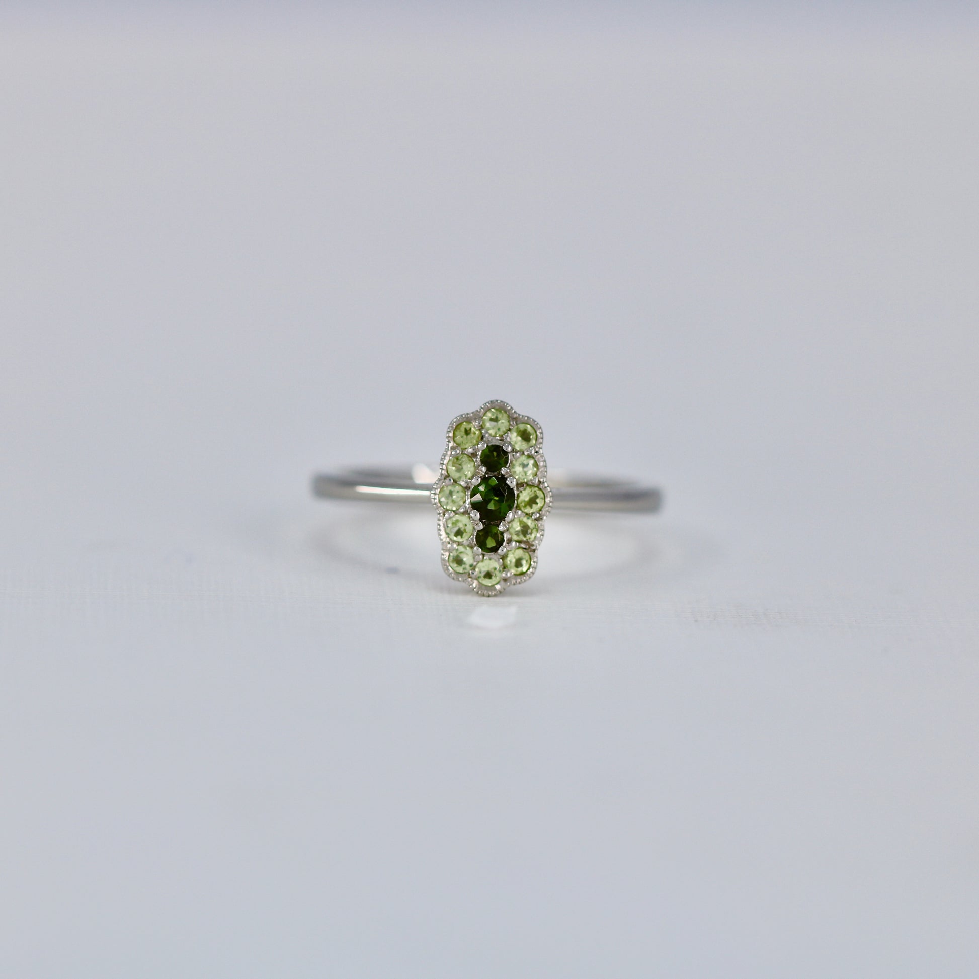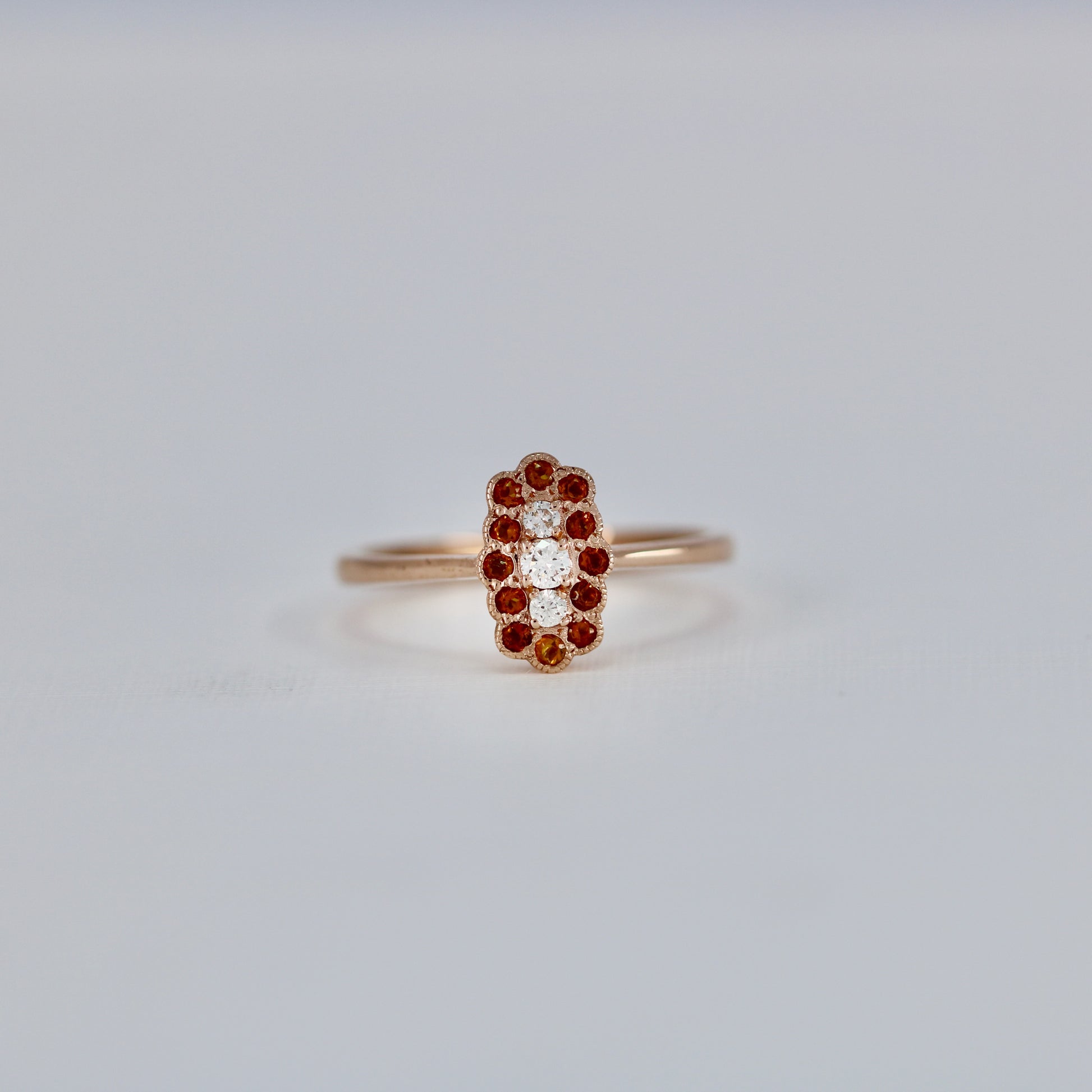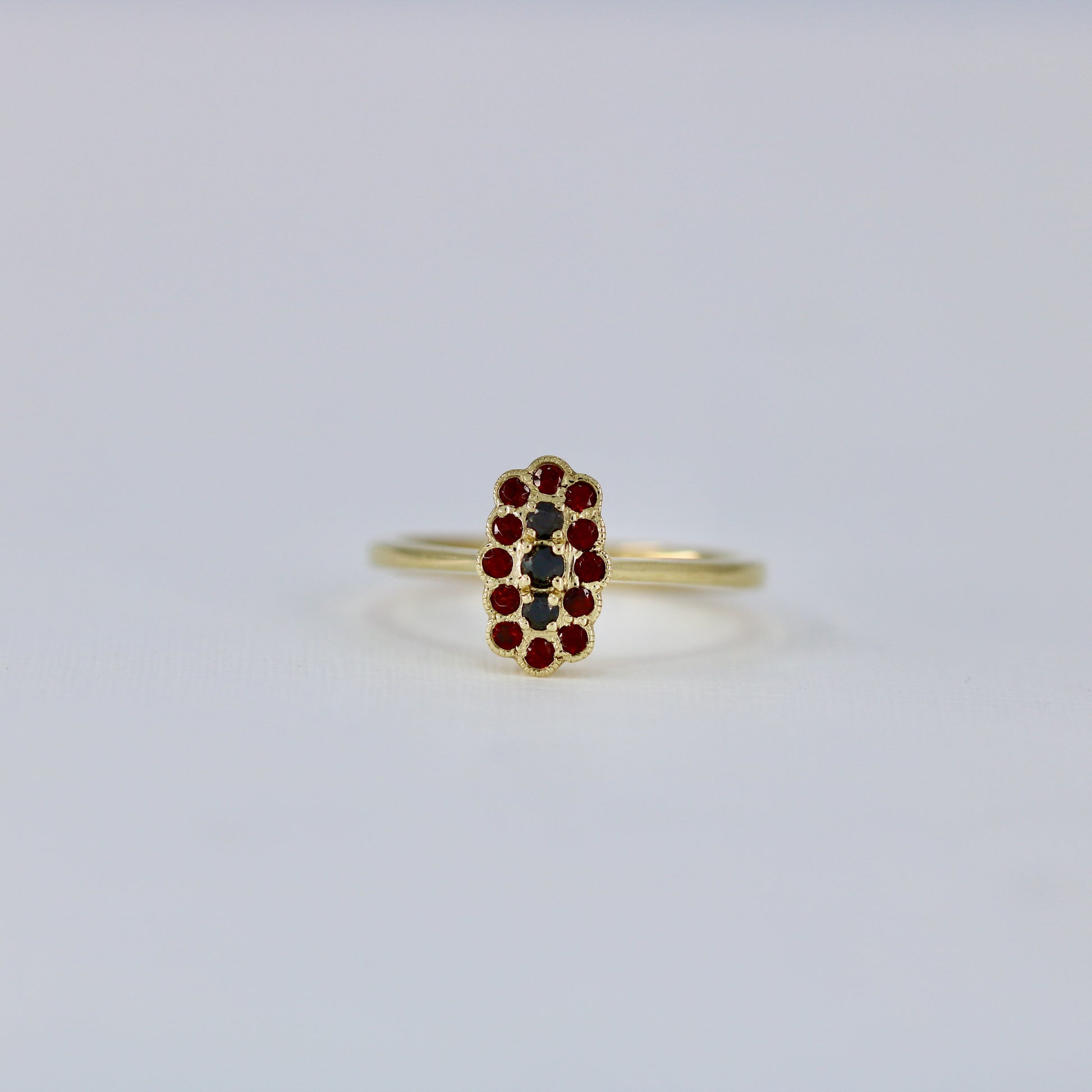 Set in Platinum, this vintage style halo ring features Green Tourmaline in the center, surrounded by 12 Peridot stones, from R9,000.00 . Ring Weight: 3.8g - Yellow gold set with black diamonds and red garnets , from R8,000.00 - Rose gold option set with diamonds and orange sapphire , from R9700.00.