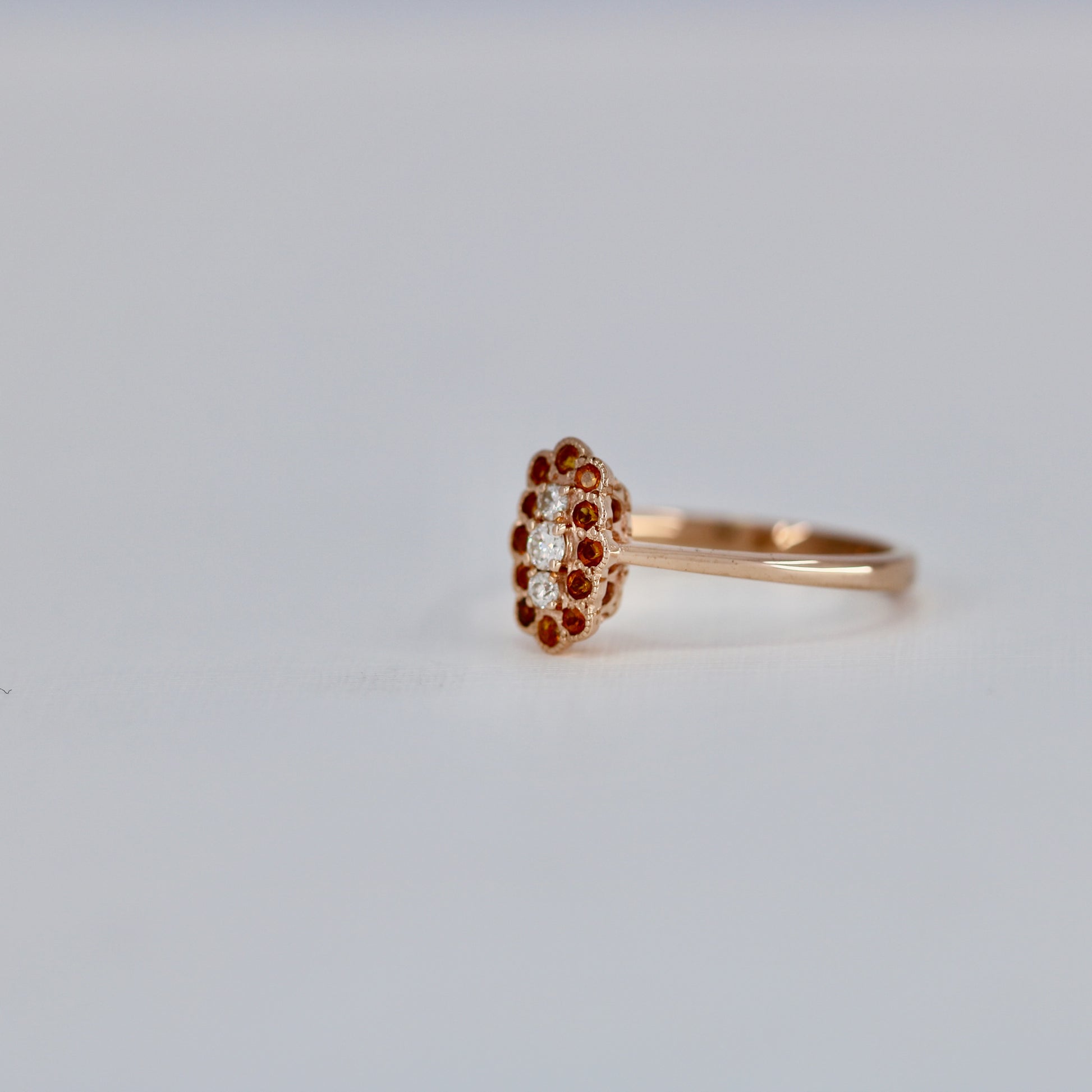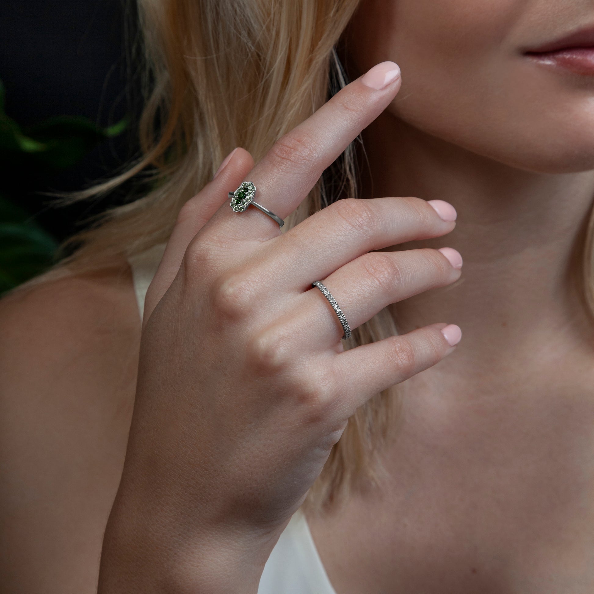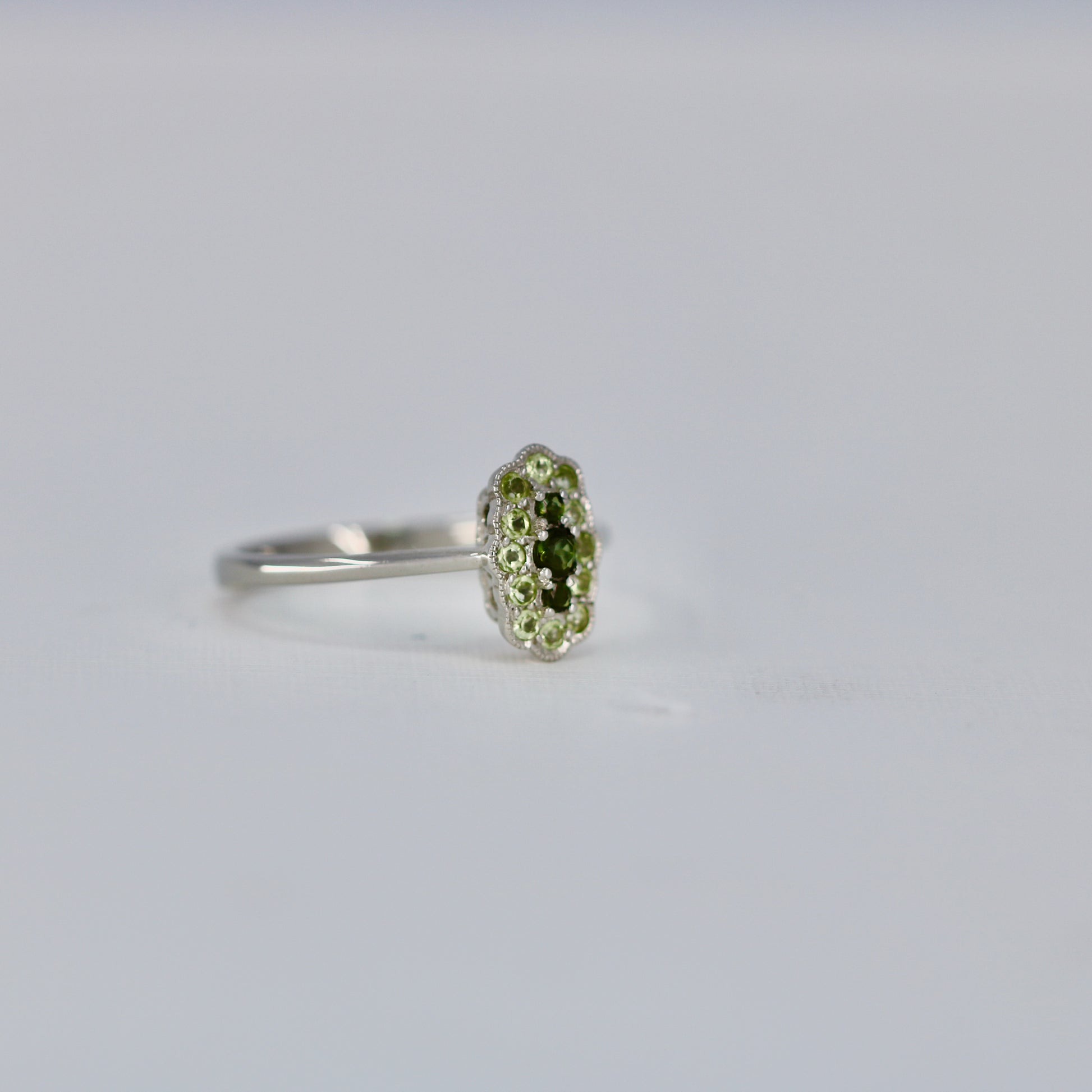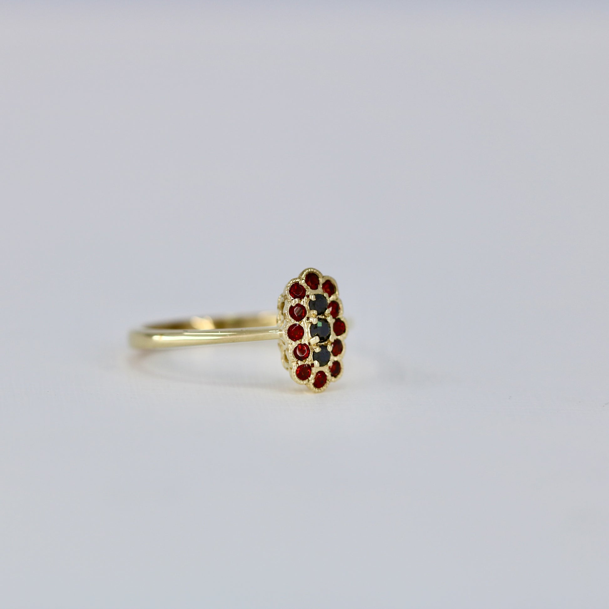 Set in Platinum, this vintage style halo ring features Green Tourmaline in the center, surrounded by 12 Peridot stones, from R9,000.00 . Ring Weight: 3.8g - Yellow gold set with black diamonds and red garnets , from R8,000.00 - Rose gold option set with diamonds and orange sapphire , from R9700.00.