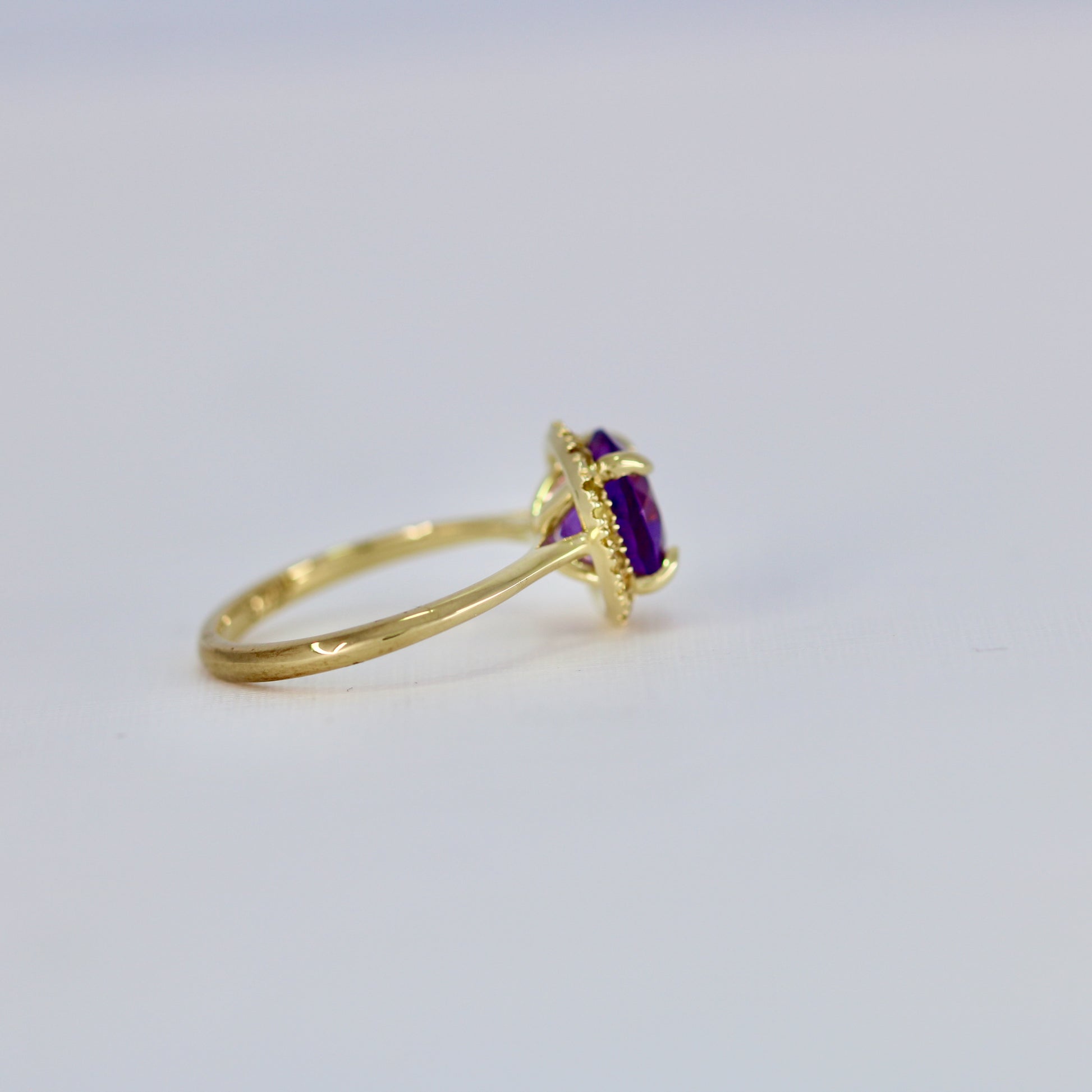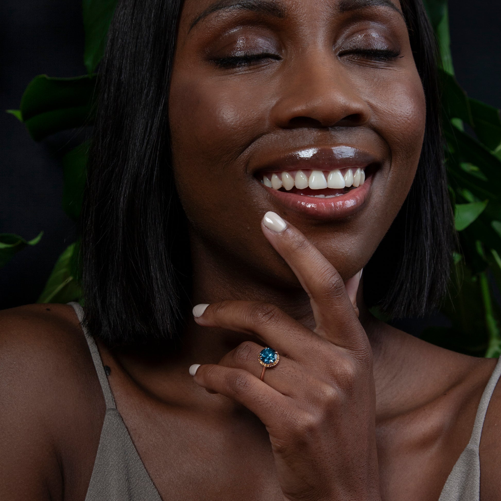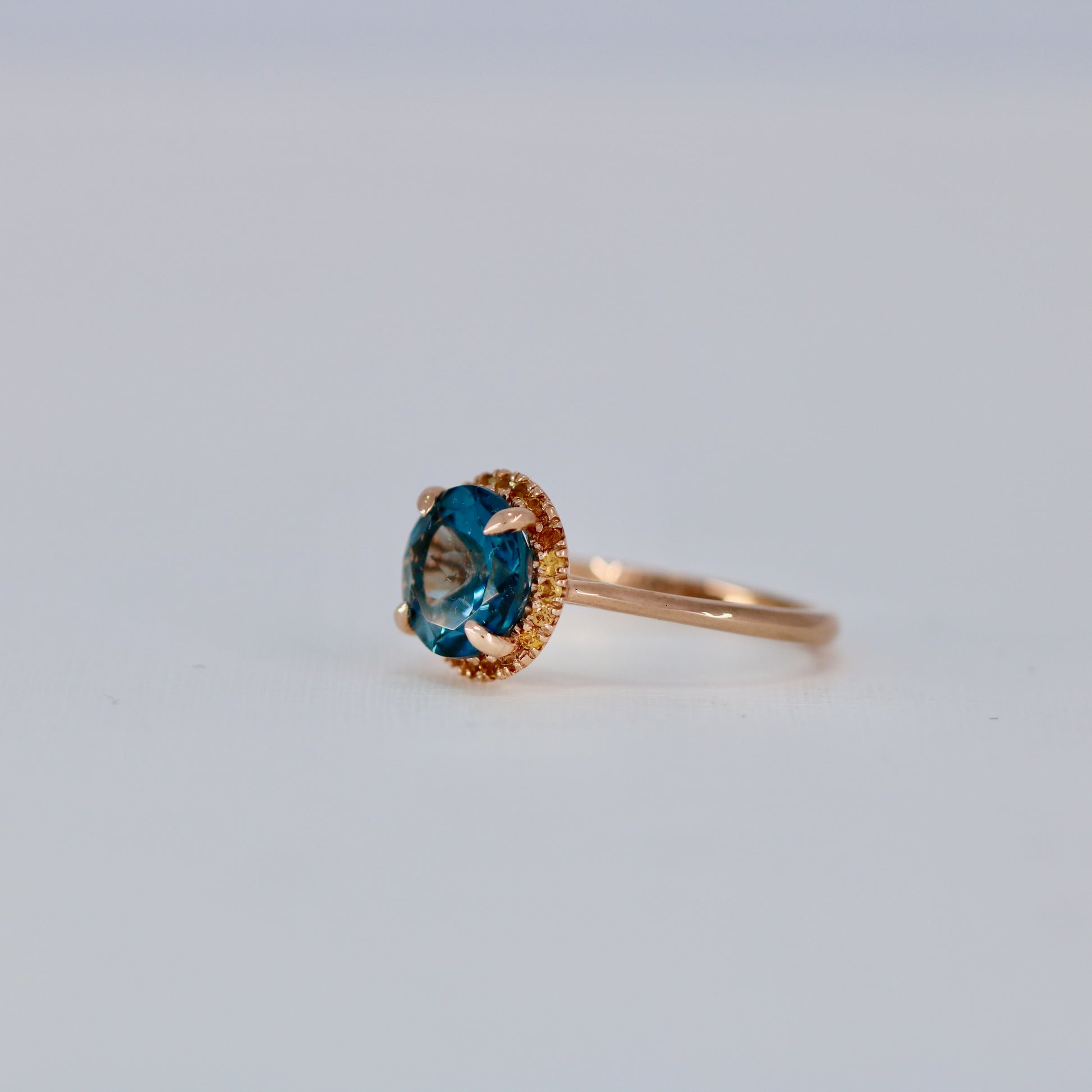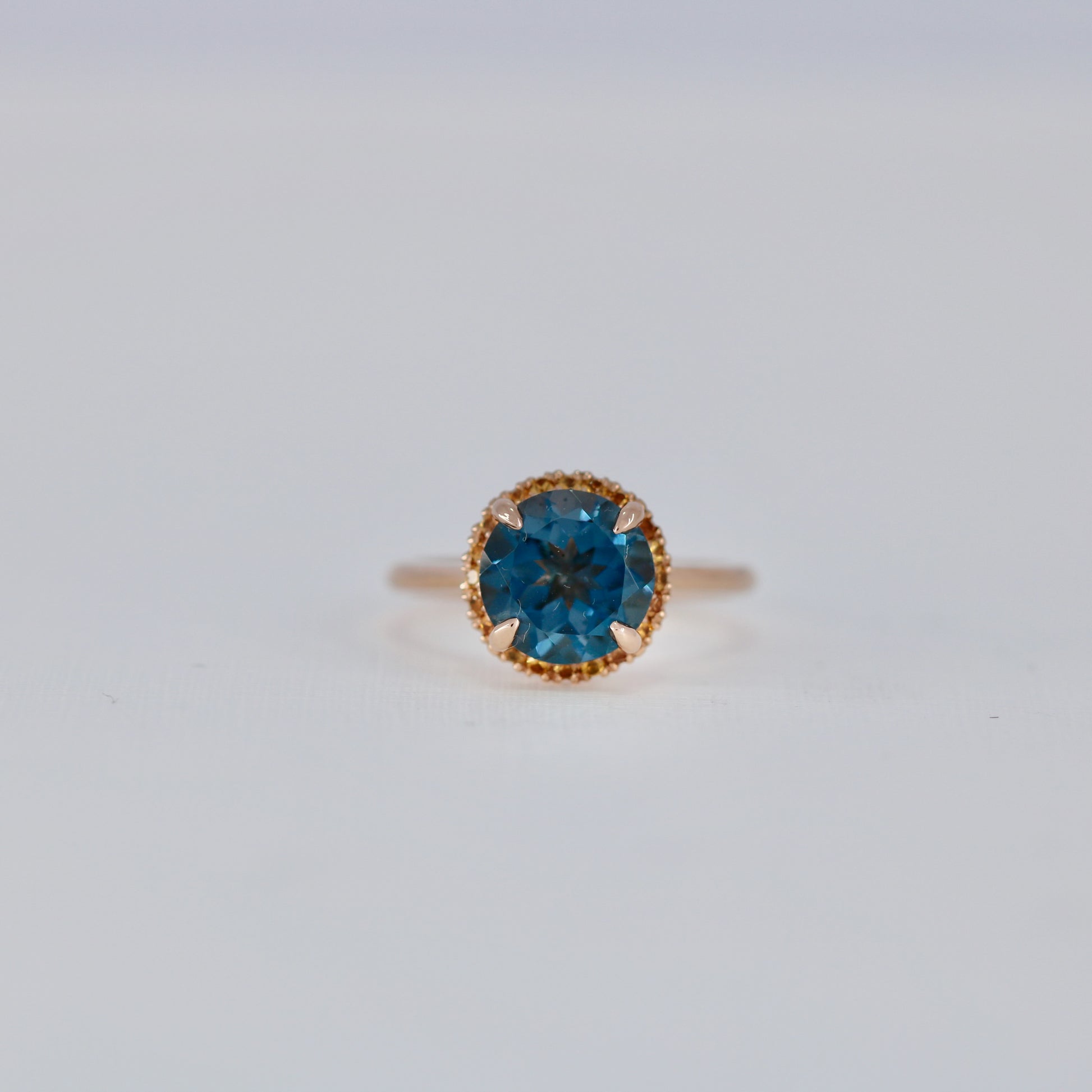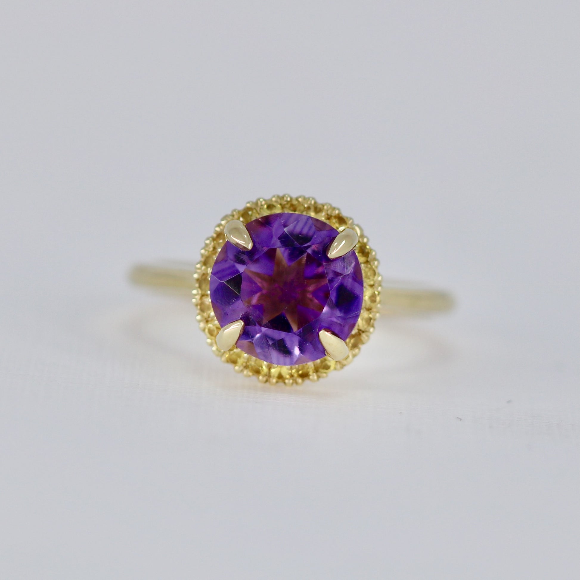 A classic halo design available in Gold and platinum , featuring a round London Blue Topaz held by a 4 claw setting. The Blue Topaz is surrounded by 20 Orange Sapphires that shines beautifully. Stone Size: 9mm Ring Weight: 2.8g and purple amethyst surrounded by yellow sapphire , pls enquire for your favourite stone options.
